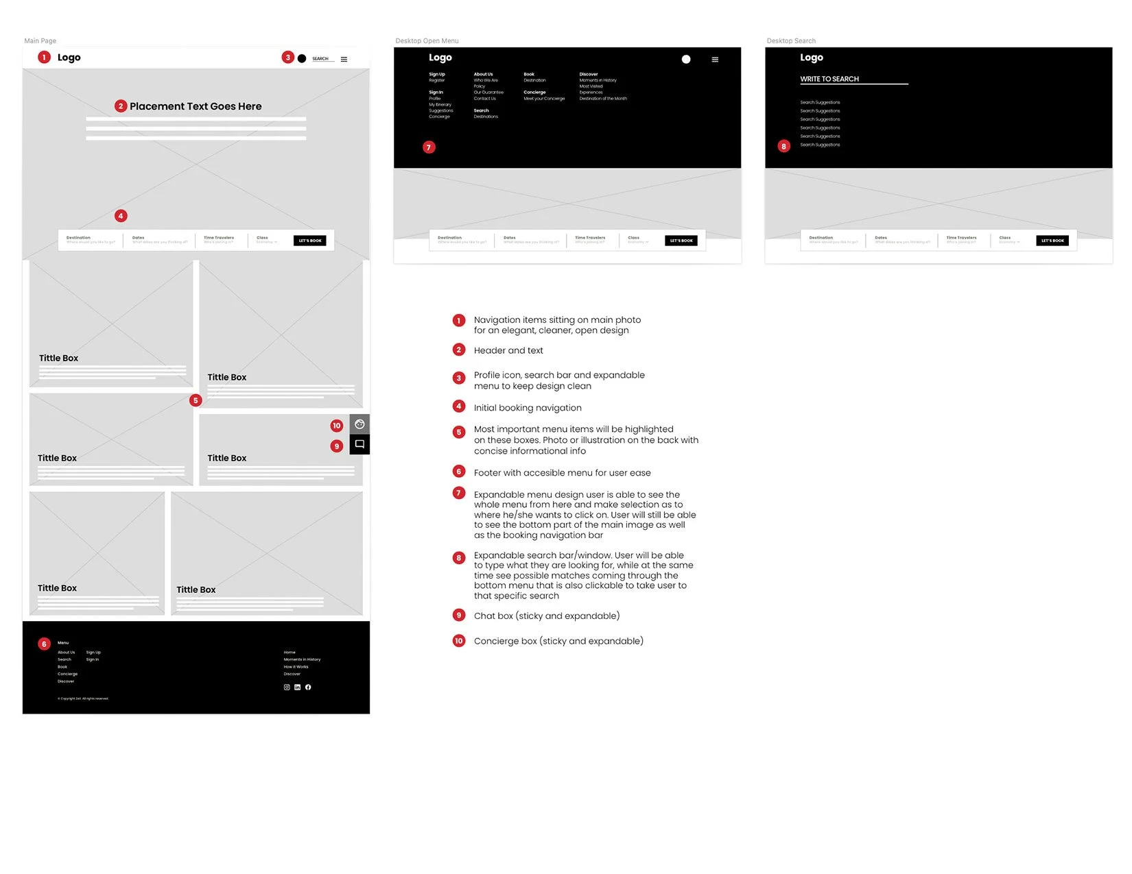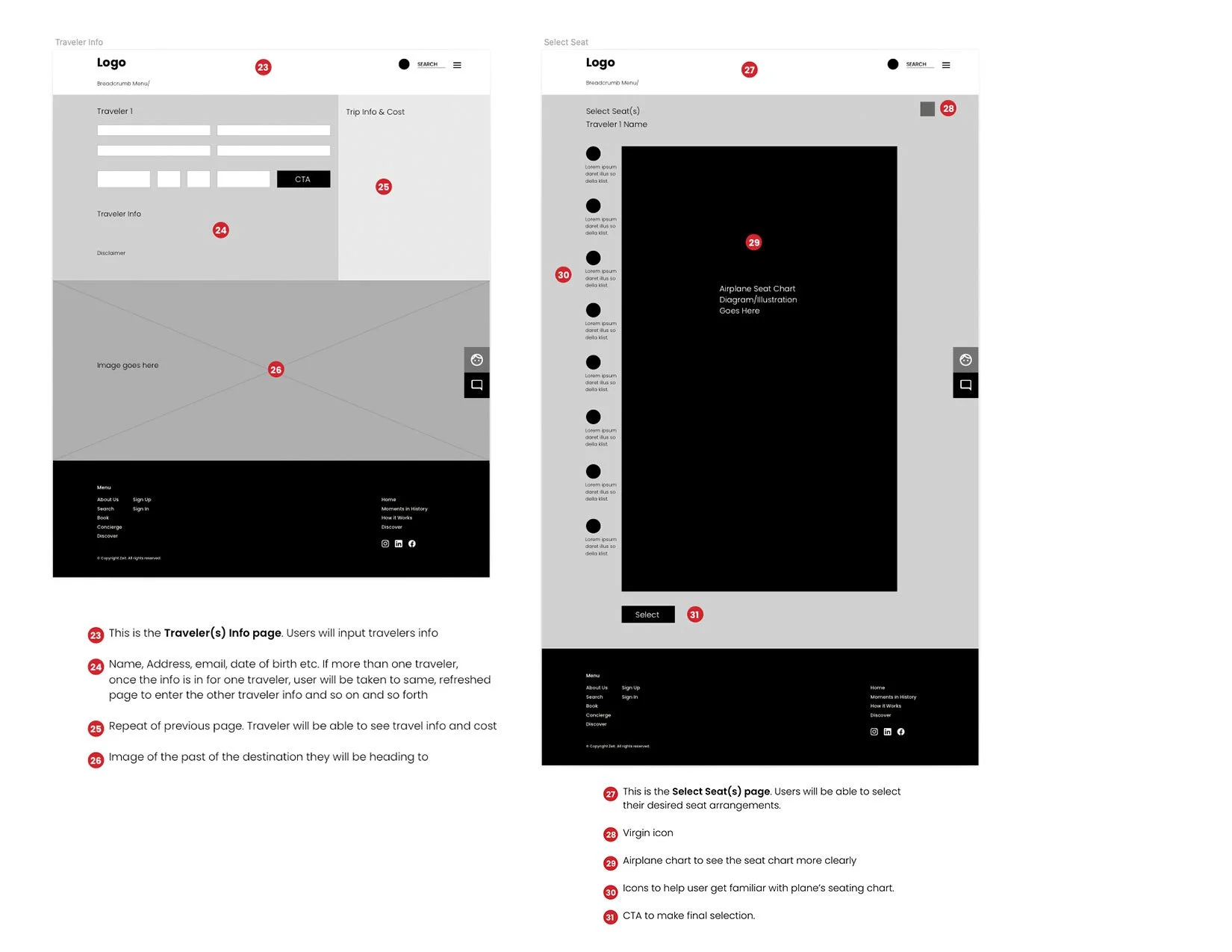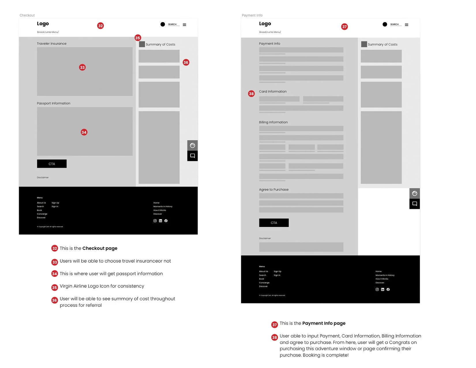It was very exciting to get to set the digital foundation of the soon-to-be responsive website! I visualized having the navigation items sit on the main photo for an elegant, clean and open design. The expandable menu allows the user to see the bottom part of the main image and well as booking navigation bar at all times. At this stage I resolved how the concierge feature would work. A sticky and expandable box ready for the user at all times. The expandable search bar/window and booking experience flow was also developed. I made sure I added Virgin Airlines branding. I accounted for the summary of travel, information that will be displayed along with Insurance and passport information, seating flow chart, checkout page, payment info and footer.