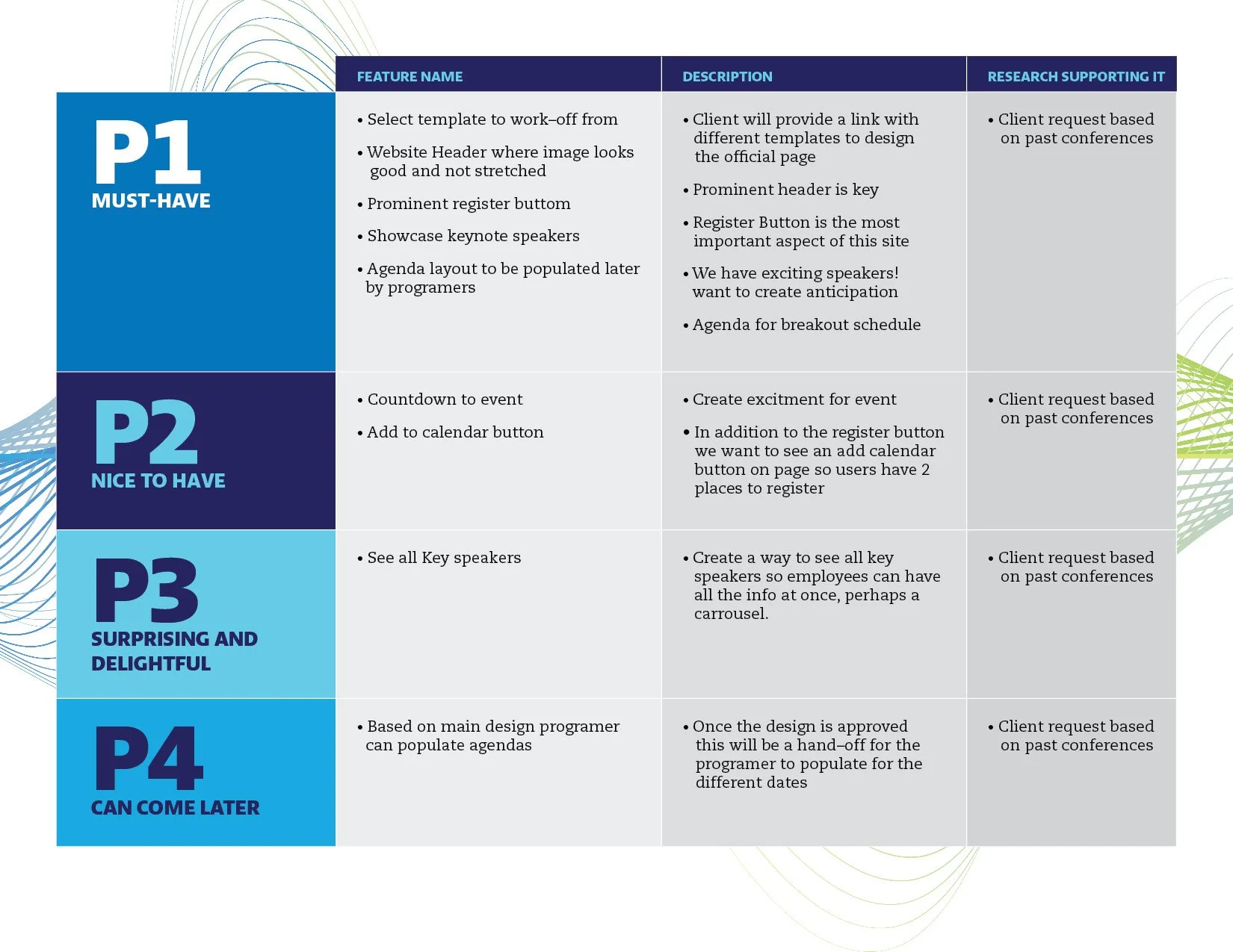 I decided this layout needs to be clean but with fun features that speak about the event and the brand. There is a lot of information to be taken in. The user needs to feel at ease when navigating the site, and be able to find the information as quickly as possible. I truly believe that if the design translates well to the users it will create anticipation and excitement around the event.